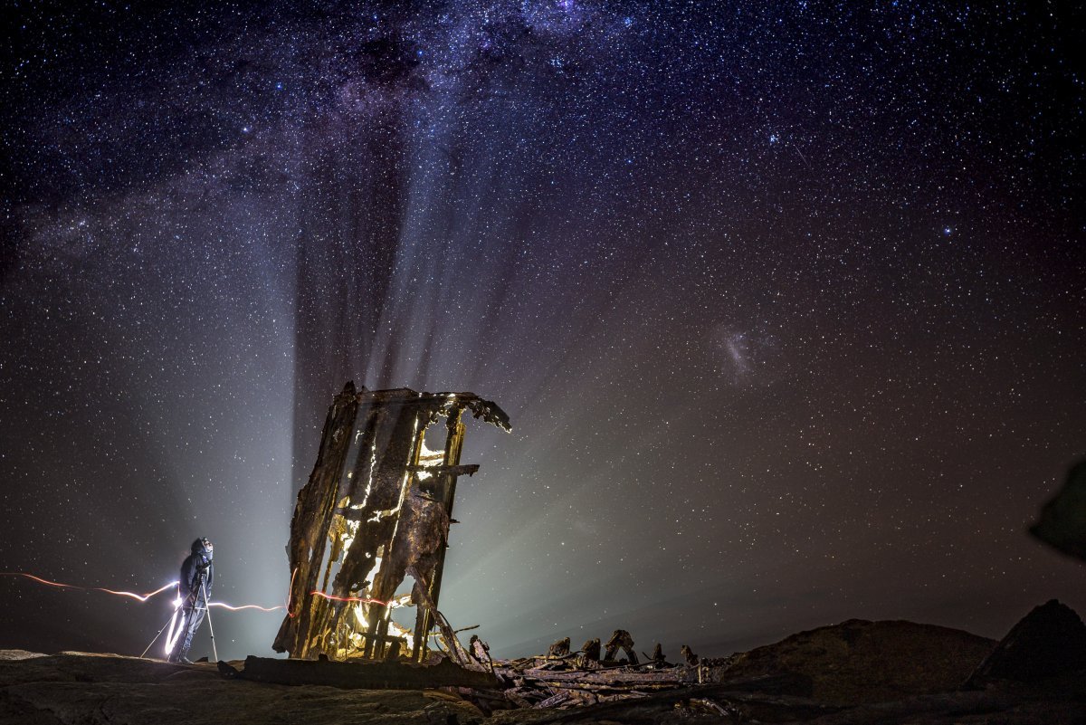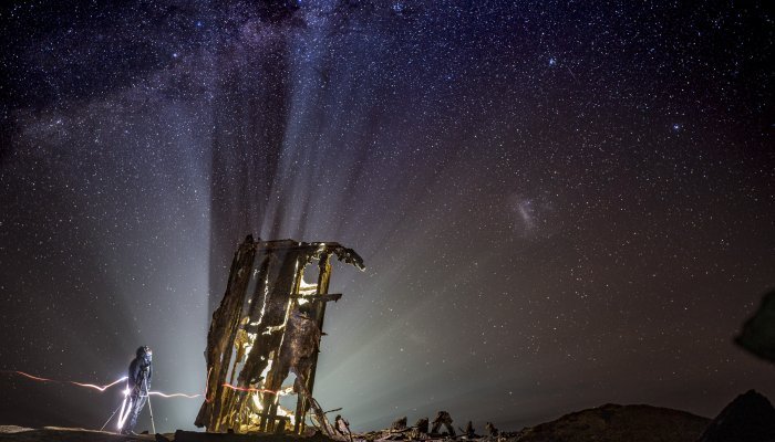 I shot on a 30-second exposure to capture some movement in the stars, and everyone had to freeze for the duration to avoid foreground blurring. A small laser torch was used to add a dash of fill-in light on the subjects and telescope.