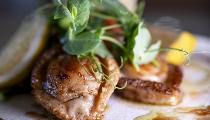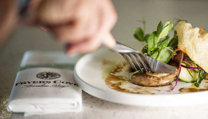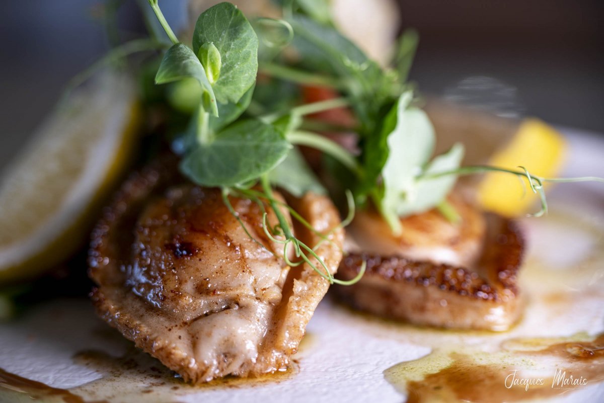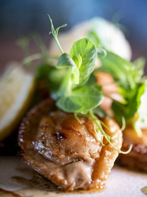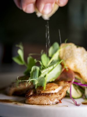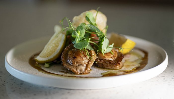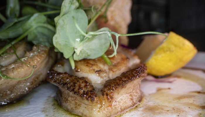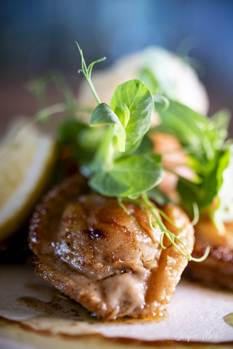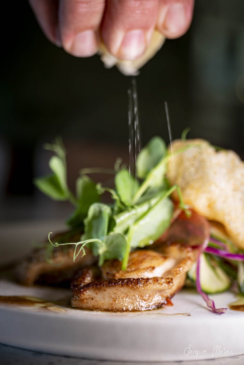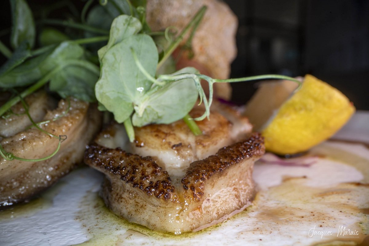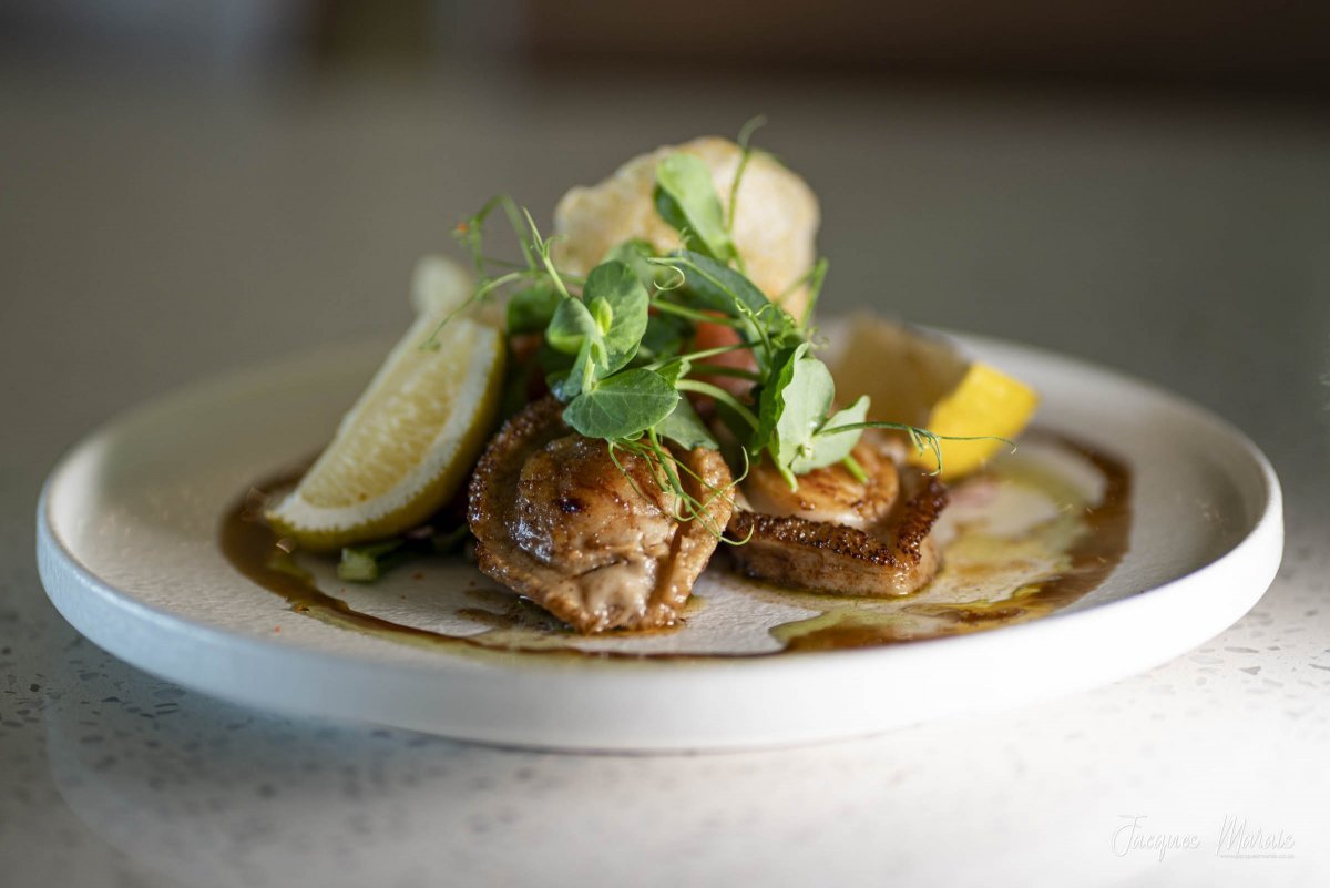 Lightly fried and perched on a bed of balsamic cucumber slices, the baby abalone is accompanied by fresh sugar snap stalks and light-as-air crisps. “This symbolises the ocean spume and underwater kelp beds”, explains chef Edna Visser.